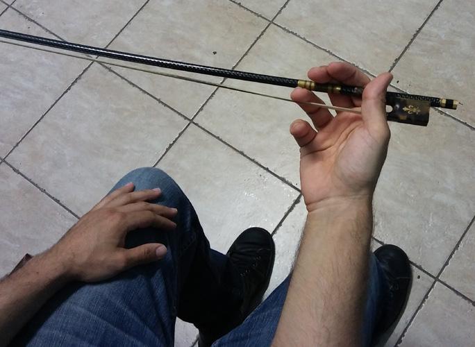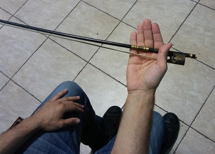 Για να κρατήσετε σωστά το δοξάρι ανοίξτε την παλάμη του δεξιού σας χεριού(**) έτσι ώστε να κοιτάει προς τα πάνω και βάλτε πάνω την βαριά του άκρη (όχι τη μύτη). Στη συνέχεια περάστε τον αντίχειρα από πάνω τον παράμεσο ανάμεσα στις χορδές και το μικρό δάχτυλο έξω από τις τρίχες του δοξαριού (βλ. φωτο). Ο δείκτης και ο μέσος θα αγκαλιάζουν το ξύλο του δοξαριού.